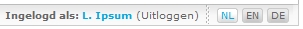 Rechtsonder ziet u hoe de echte naam waarmee u bent ingelogd, dit is een andere naam dan uw gebruikersnaam (maar kan hetzelfde zijn). Uw echte naam is uw eigen naam of administrator. In dit voorbeeld bent u ingelogd als L. Ipsum. U kunt op (uitloggen) klikken om uit te loggen. U komt dan op de inlogpagina van InSide Edit en u kunt inloggen als een andere gebruiker. Helemaal rechtsonderin, rechts naast 'ingelogd als' kunt u een de taal kiezen waarin u wilt werken.