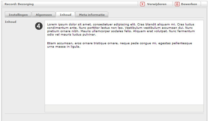 Met het tabblad Inhoud krijgt u de (4) inhoud van de pagina te zien. Als de pagina op bewerken staat dan ziet u een editor.