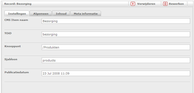 Bovenin de rechterpagiona staan de knoppen: Instellingen, Algemeen, Inhoud en Meta informatie.