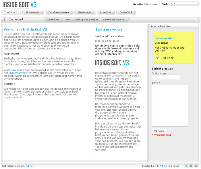 Zodra u in InsideEdit bent ingelogd komt u op de DashBoard pagina. Hier staat een welkomstscherm en het laatste nieuws van InSide Edit. U treft hier een vragenformulier waar u vragen aan webinzicht kunt stellen en support kunt krijgen. Op het DashBoard kunt u binnenkort ook een forum met interne mededelingen bijhouden.