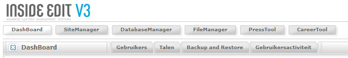 De menu-items zijn: Dashboard, Sitemanager, Databasetool, Filemanager, Newstool en Career: