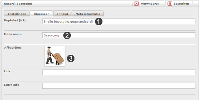 3) Afbeelding is een afbeelding op de pagina. U ziet een verkleinde versie van de afbeelding op de pagina. Als er geen afbeelding in staat dan ziet u hier een leeg veld.