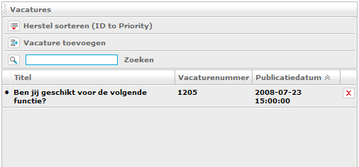 Als u een vacature wilt verwijderen dan klikt in het vacatureoverzicht op het rode kruisje naast de vacature. Let op verwijderen is definitief, u kunt een verwijderde vacature niet meer terughalen.